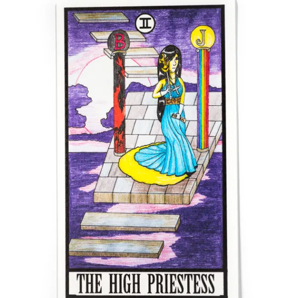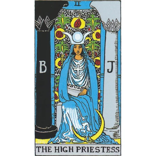 Η Αρχιέρεια κάθεται ανάμεσα σε δύο κολώνες, μία μαύρη (B) και μία λευκή (J). Πίσω της υπάρχει ένα πέπλο με ρόδια. Τι κρύβεται πίσω από το πέπλο; Η Αλήθεια. Σε αντίθεση με τον Μάγο που φωνάζει και δρ΅ά, η Αρχιέρεια σιωπά και γνωρίζει.